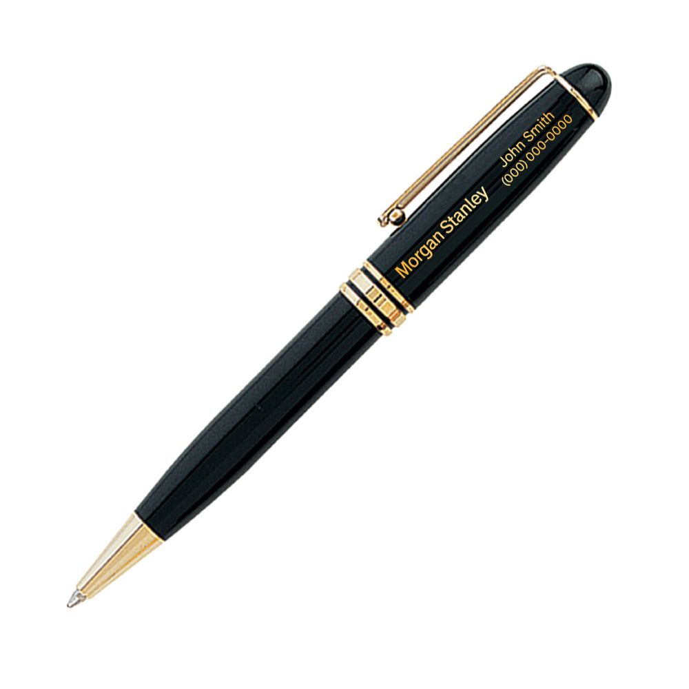 Twist action brass ballpoint pen and cap-off rollerball. Elegant enamel finish color with shining gold trims. Features your logo, name, and phone number laser engraved.