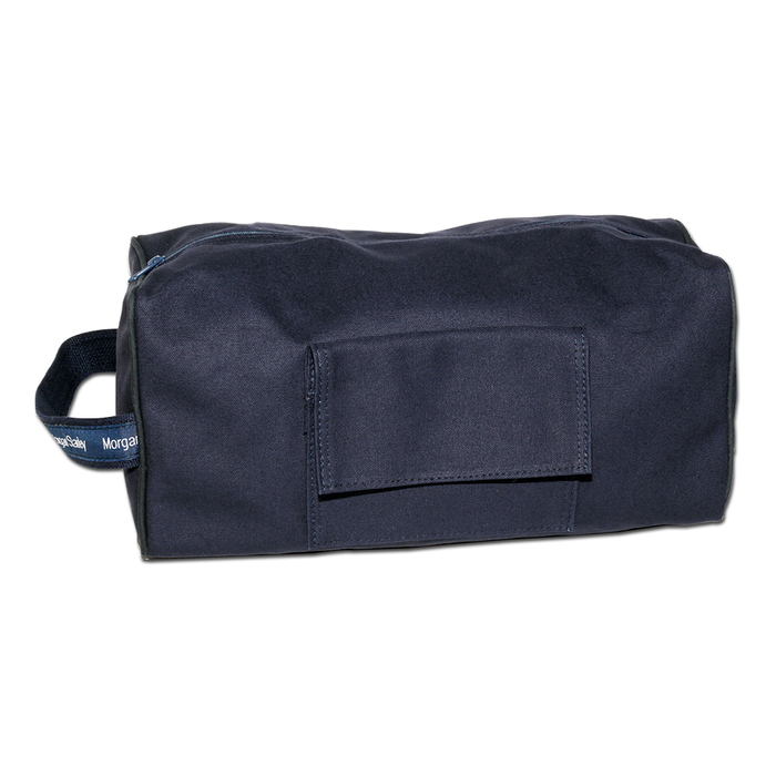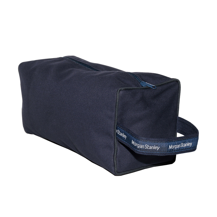 Navy canvas shoe bag with Morgan Stanley logo ribbon on handle. Includes outer pocket for golf tees and divot tool. 14.5" x 7" x 6.5"