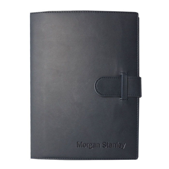 This refillable bound notebook comes with 128 sheets of lined paper. Features an elastic pen loop, tab and loop closure, ribbon page markers, business card slot. The Morgan Stanley logo is blind stamped in the lower right corner of the cover. Dimensions: 7" x 9.75". FSC Mix Certified.