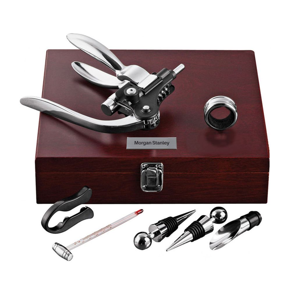 Nine-piece wine set features a cherry polished wooden case for compact storage. Includes an ergonomic bottle opener, foil seal cutter, drip ring, thermometer, pourer, two wine stoppers, and two replacement corkscrew bits. Featuring the Morgan Stanley logo engraved on a silver plate on the cover. Dimensions: 9.75" H x 11" W x 2.75" L.