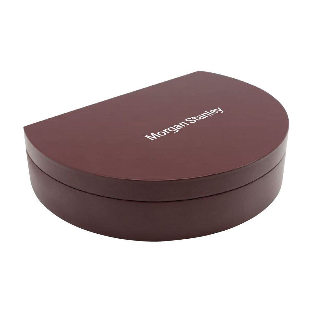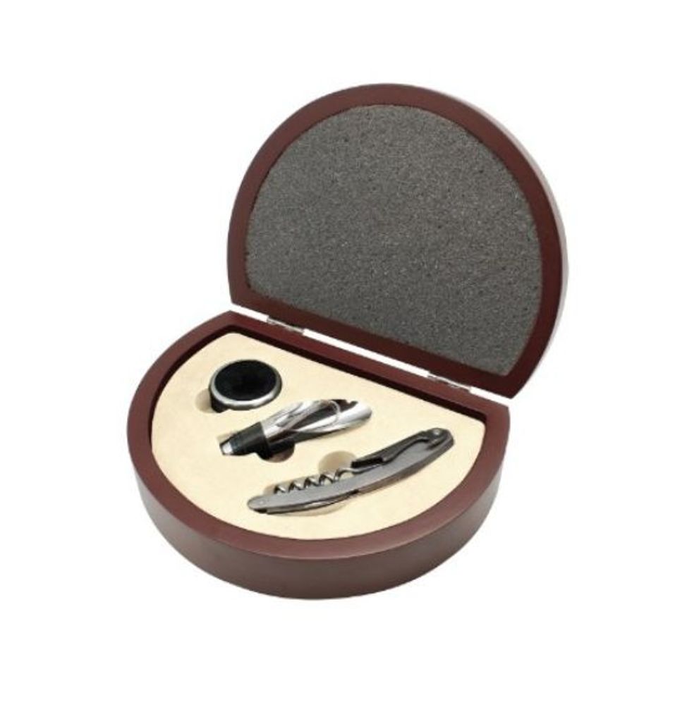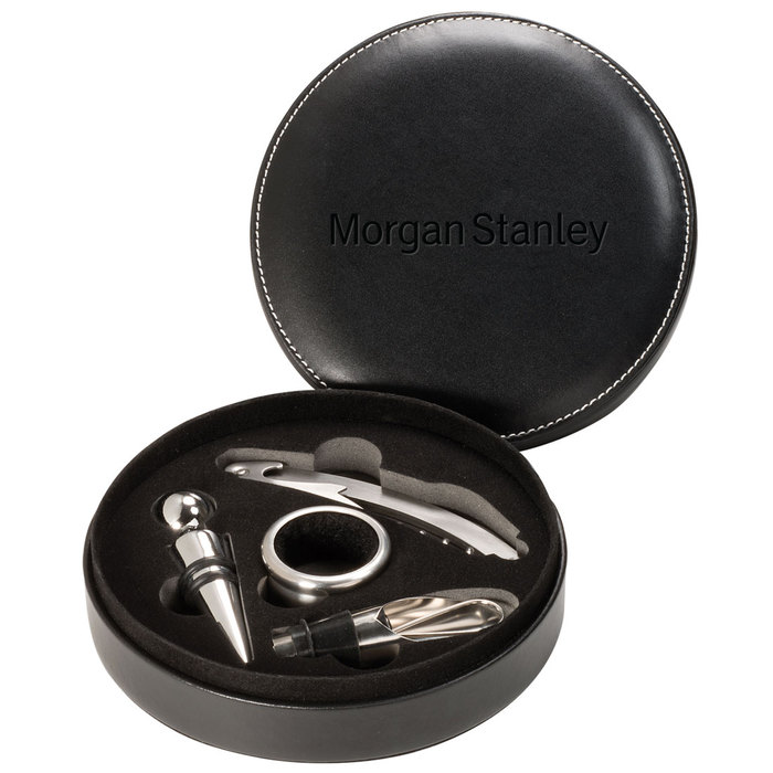 This attractive padded leather case includes a full set of stainless steel tools: waiter's key style corkscrew, pourer with stopper, drip ring and bottle stopper. The Morgan Stanley logo is debossed on the lid. Dimensions: 1-1/2" H x 5-7/8" Dia.