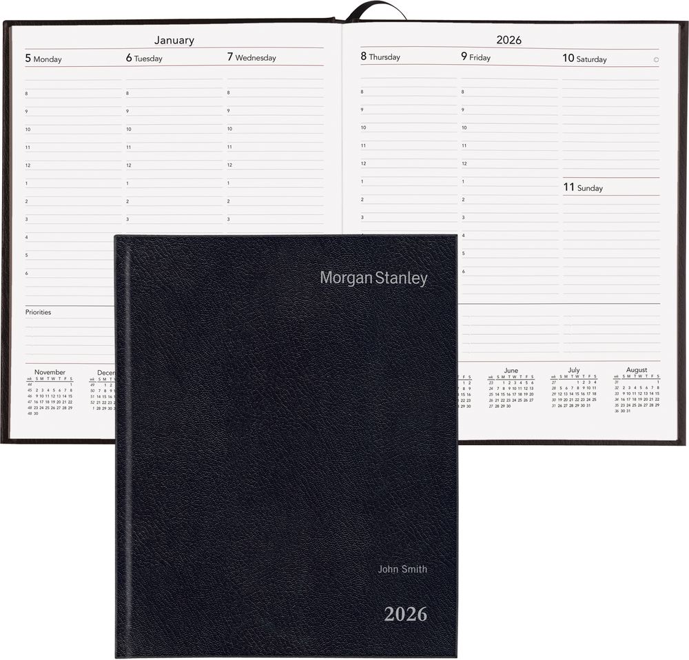 Morgan Stanley logo stamped on the front cover in silver foil. Filler paper library bound into black cover. Designed for those who pay close attention to detail and world-class design. Features include week-at-a-view and month-at-a-view formats, satin ribbon markers, time zones, and area code charts, toll-free numbers, special dates, interest rates, advance planning, address section, and more. Cover made of black Skivertex.