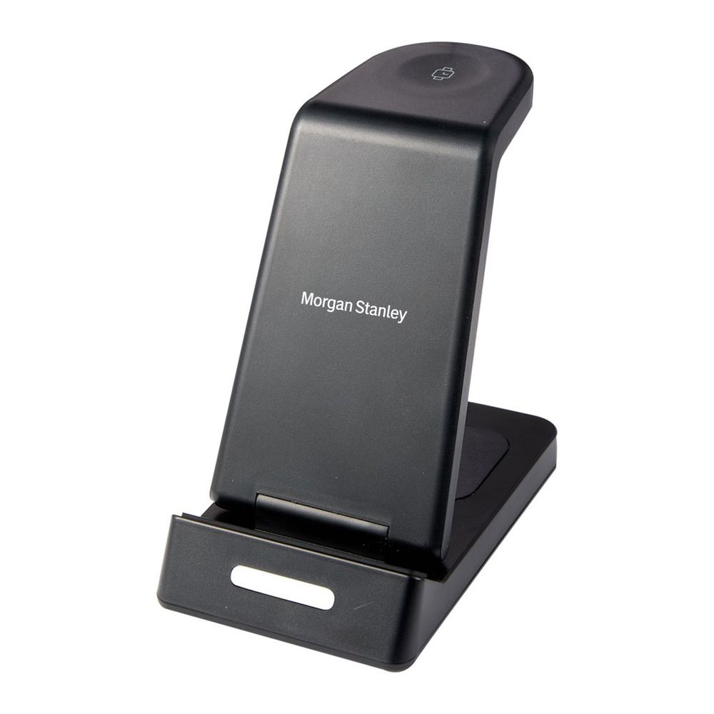 The 3-in-1 Wireless Charging Stand is a versatile and innovative charging solution that simplifies the way you power up your devices. This thoughtfully designed stand features dedicated charging spots for smartphones, Apple Watches, and AirPods/AirPods Pros, ensuring that your essential tech gadgets are always organized and fully charged. The foldable front phone stand spot provides an adjustable and convenient wireless charging experience, delivering up to 15W for Android devices and up to 7.5W for all iPhone 8 and later models. Whether you prefer to charge your phone vertically or horizontally, this charging stand accommodates your needs with ease. Features your logo.