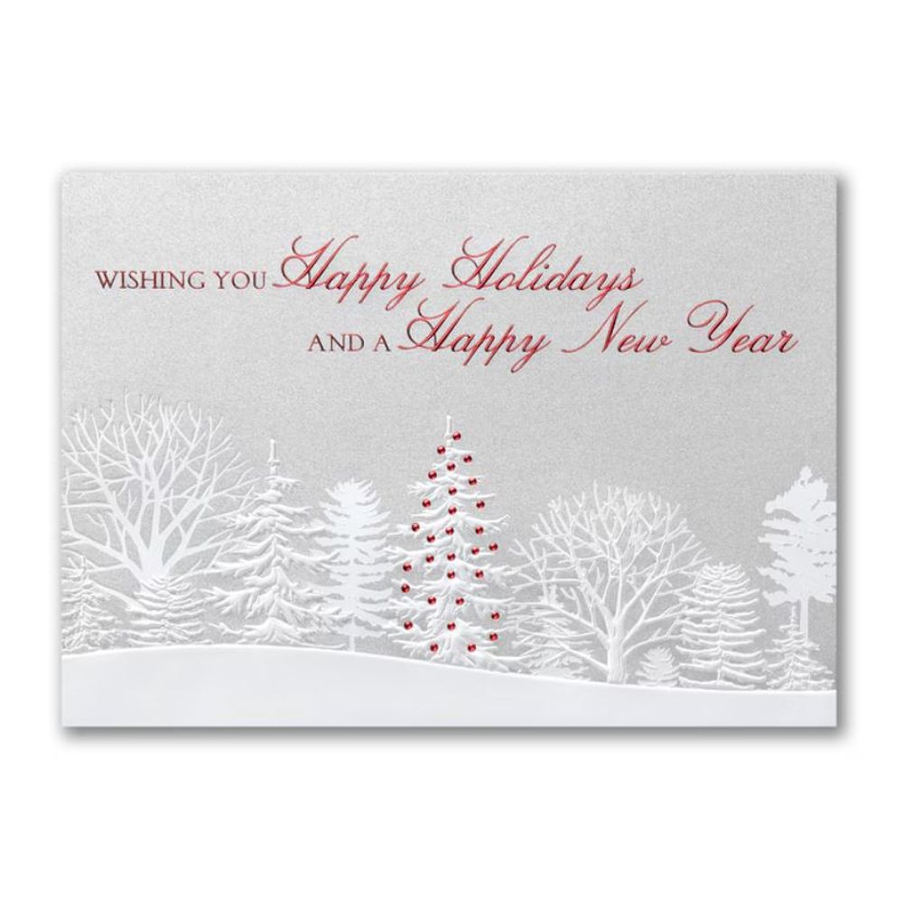 A forest of snow-covered trees embossed with matte white foil surround a central pine decorated with bright red Christmas ornaments. This beautiful contemporary holiday card wishes everyone happy holidays and a happy new year. Dimensions: 7 7/8" x 5 5/8" Folded. Price Includes: Printed card with choice of blank unlined or lined envelope (white). Paper: Silver Shimmer 105 lb. Features your logo inside the card.