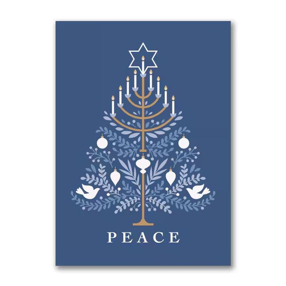 Embrace the beauty of unity by sending an interfaith holiday card with a symbolic design that celebrates the season with the fusion of Hanukkah and Christmas traditions. A Christmas tree grows from the base of a menorah in a white design set against a serene blue background. Dimensions: 5 5/8" x 7 7/8" Folded. Price includes printed card with blank envelope. Paper: White Smooth 120 lb. Features your logo inside the card.