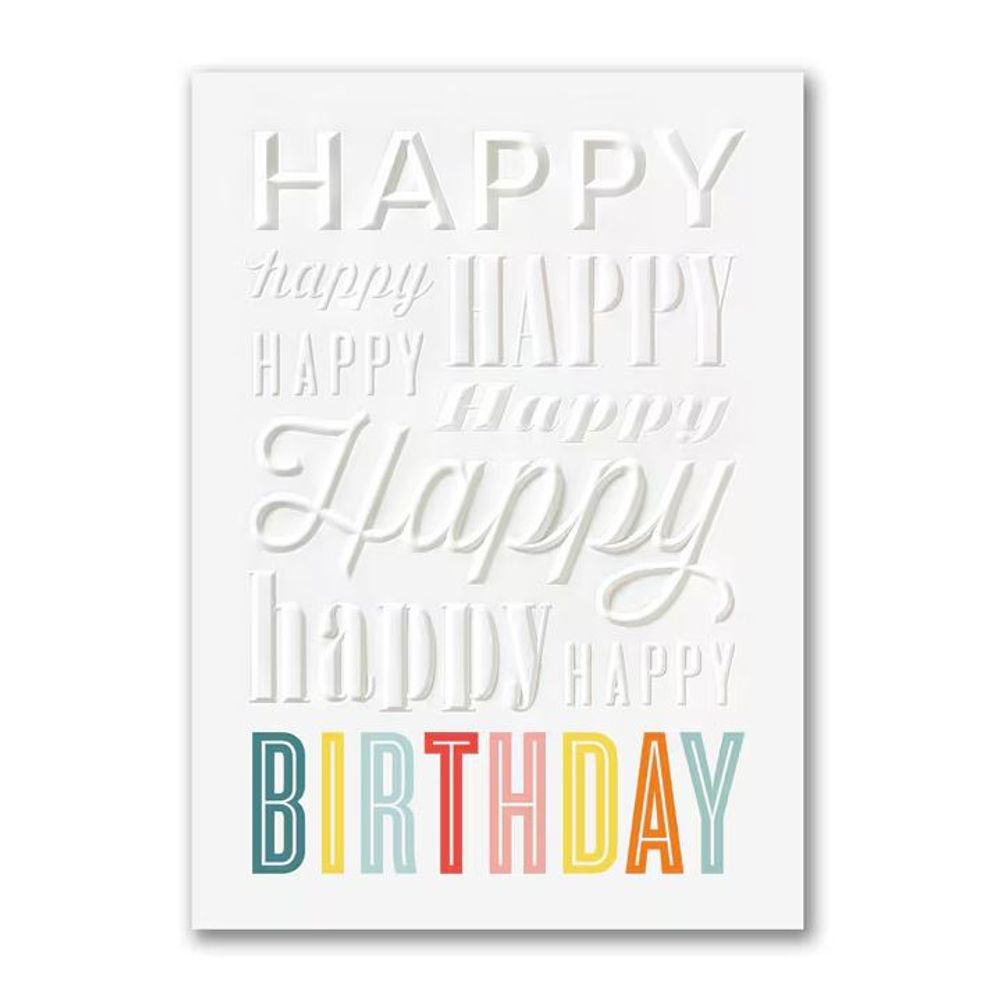 Typography is the star of this contemporary birthday card. "Happy" is embossed in several cheerful fonts that draw the eye down to the bottom of the card, where "Birthday" has been printed in candle-colored letters. Dimensions: 5 5/8" x 7 7/8" Folded. Price includes printed card with blank envelope. Paper: White Smooth 100 lb. Features your logo inside the card.