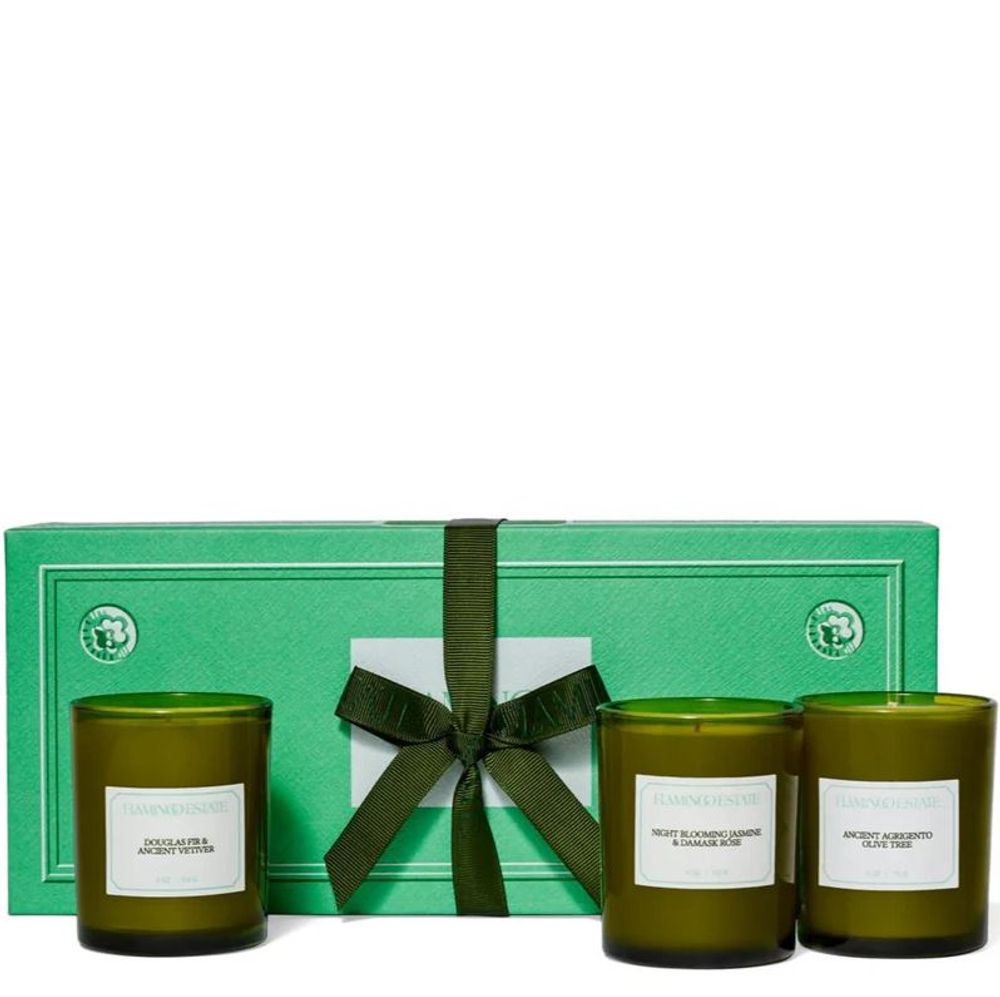 Flamingo Estate's first Candles were earthy and herbaceous, most of them inspired by one ingredient or fragrance. But the Estate is filled with a sea of flowers, grasses, and trees — like intoxicating Night Blooming Jasmine, Damask Roses, Olive Trees, and Vetiver. If you walk around the garden, it’s this combination of aromas that make it so magical. So this set represents the second generation of FE candles. Each one is complex and layered with the sensual fragrances from the property. They are FE's most unique, and now the most requested. Gift Set comes in an embossed Gift Box, finished with a grosgrain Bow. 4oz. Candles. Burn time 60 hours.