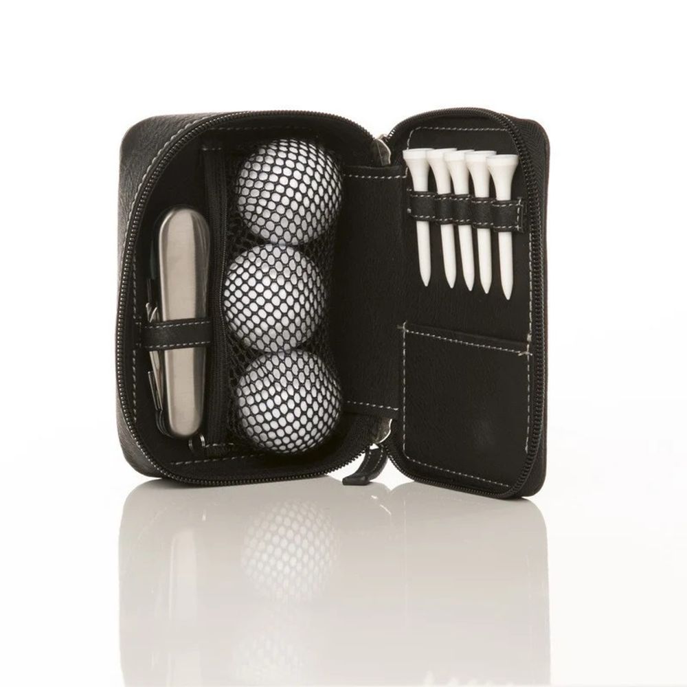 The Mini Golf Club set features everything you need for a day on the course. This set contains 3 golf balls, 5 tees, a divot repair tool, and comes in a sleek genuine leather case. Your logo is featured on the zip pull.