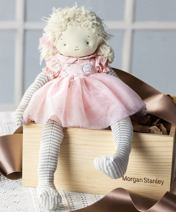 Sweet as can be, Little Miss Caroline is the most polite of tea party pals. Dressed in a petal pink cotton gown with a soft knit body, yarn hair and stitched facial features, huggably soft Caroline will surely become a favorite dolly. Doll measures 14” tall. Comes gift wrapped in a hand crafted wood crate with ribbon. Features your logo hot-iron branded onto the wood crate. Crate size: 10 ½” x 9” x 5”