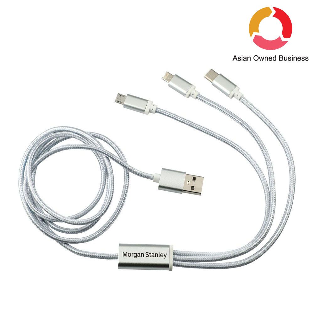 Charge your devices anywhere with this 3-in-1 charge and sync cable. Includes Micro USB, Type C, 8 pin/Lightning). Compatible and portable. Features your logo on the cable. 48" L