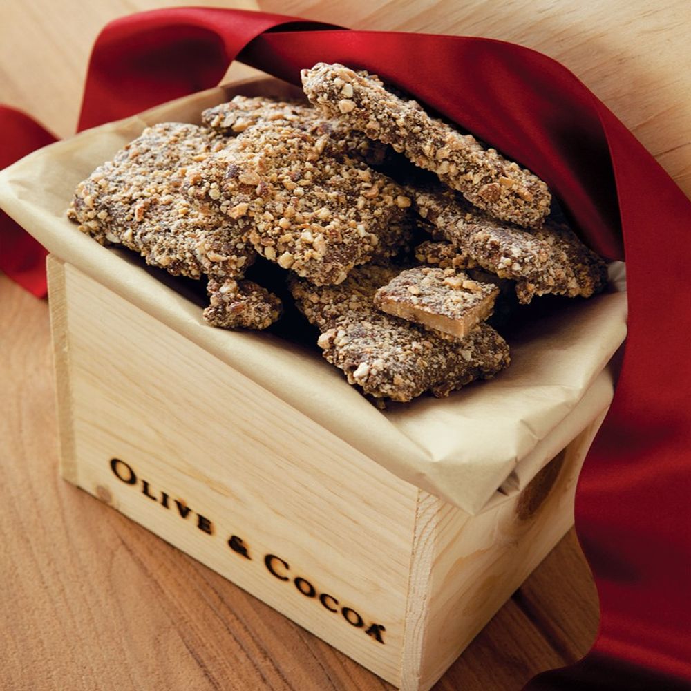 Buttery English toffee covered in milk chocolate and a dusting of chopped roasted almonds is an absolute indulgence. A full pound of this traditional treat comes gift wrapped in a hand crafted wood crate with ribbon. 8”L x 6”W x 6”H. Features your logo hot-iron branded onto the wood crate.