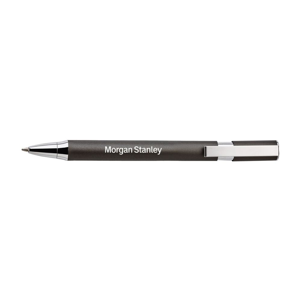 Japanese stationery inspired executive metal pen with silver trim. Strong push cap retraction. Ultra modern angular shape. Black ink. Features your logo engraved on the barrel.