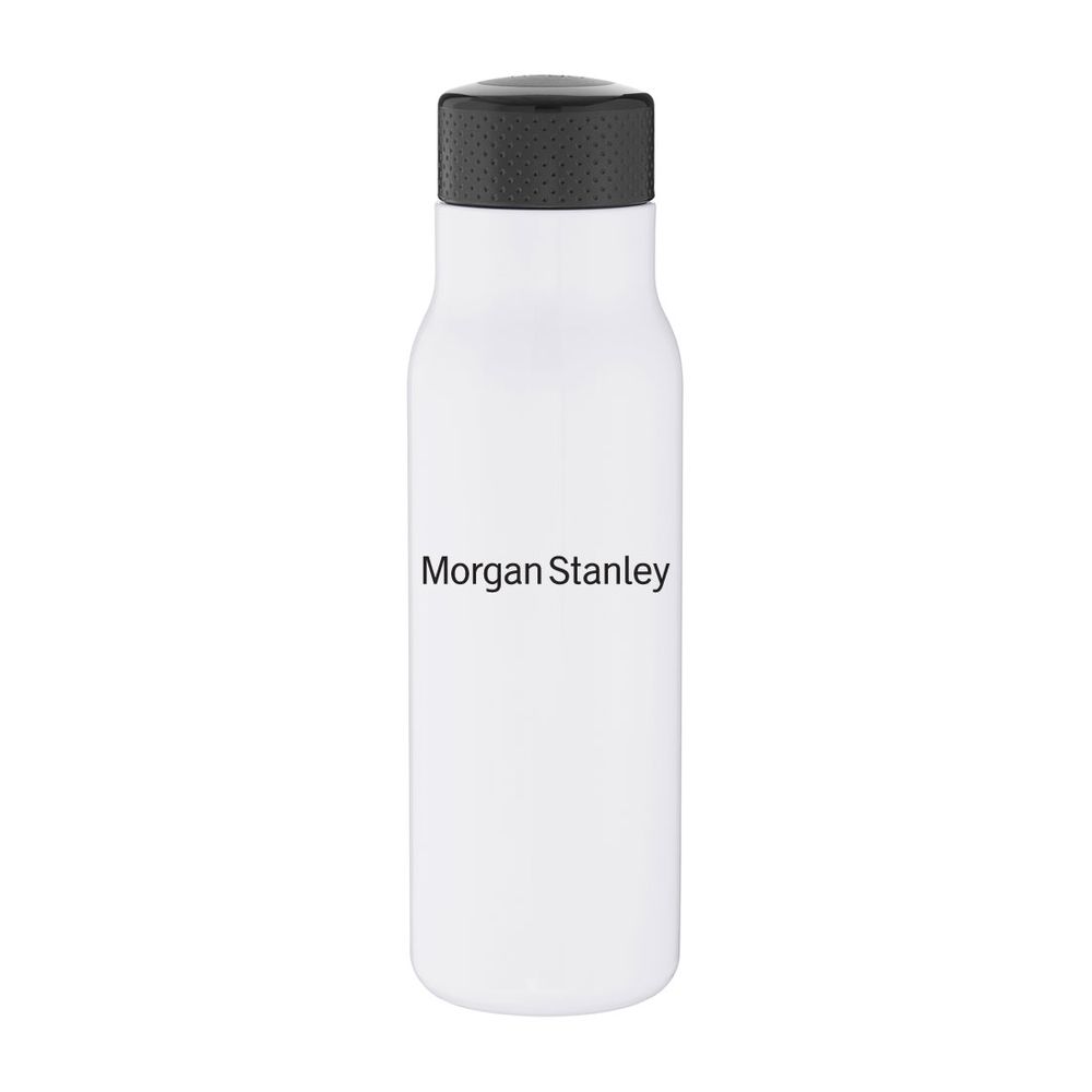 Single wall stainless steel bottle with threaded lid and soft-touch finish. For cold beverages only. Hand wash recommended. Do not microwave. Capacity: 25 oz. 9.5" H x 2.875" W. Features your logo printed. Comes packaged in a box.