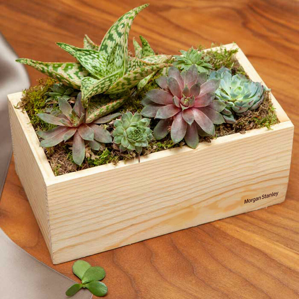 Send a garden full of gratitude with an arrangement of lush succulents. Hardy and easy to care for, assorted succulents are expertly planted in a hand-crafted wood. Features your logo hot-iron branded onto the wood crate and "Thank You" on the opposite side. Requires two-day shipping.