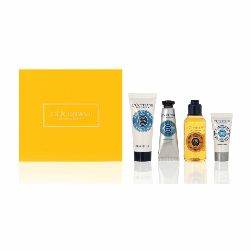 The On The Go Shea Essentials includes Shea Butter Hand Cream (0.3oz), Shea Ultra Rich Body Cream (0.6oz), Shea Fabulous Oil (1.1 fl oz), Shea Ultra Rich Comforting Cream (0.17oz).