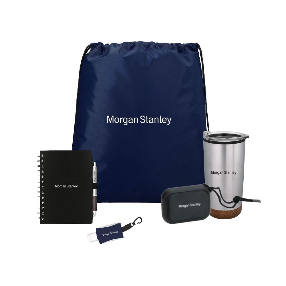 Kit includes: 20oz. Stainless Steel Tumbler (MS885129SLV), Recycled Spiral Notebook with Pen (MS88903K), Waterproof Wireless Speaker (MS1717), Hand Sanitizer (MS88502). Comes packaged together in a Morgan Stanley Cinch Pack (MS366).