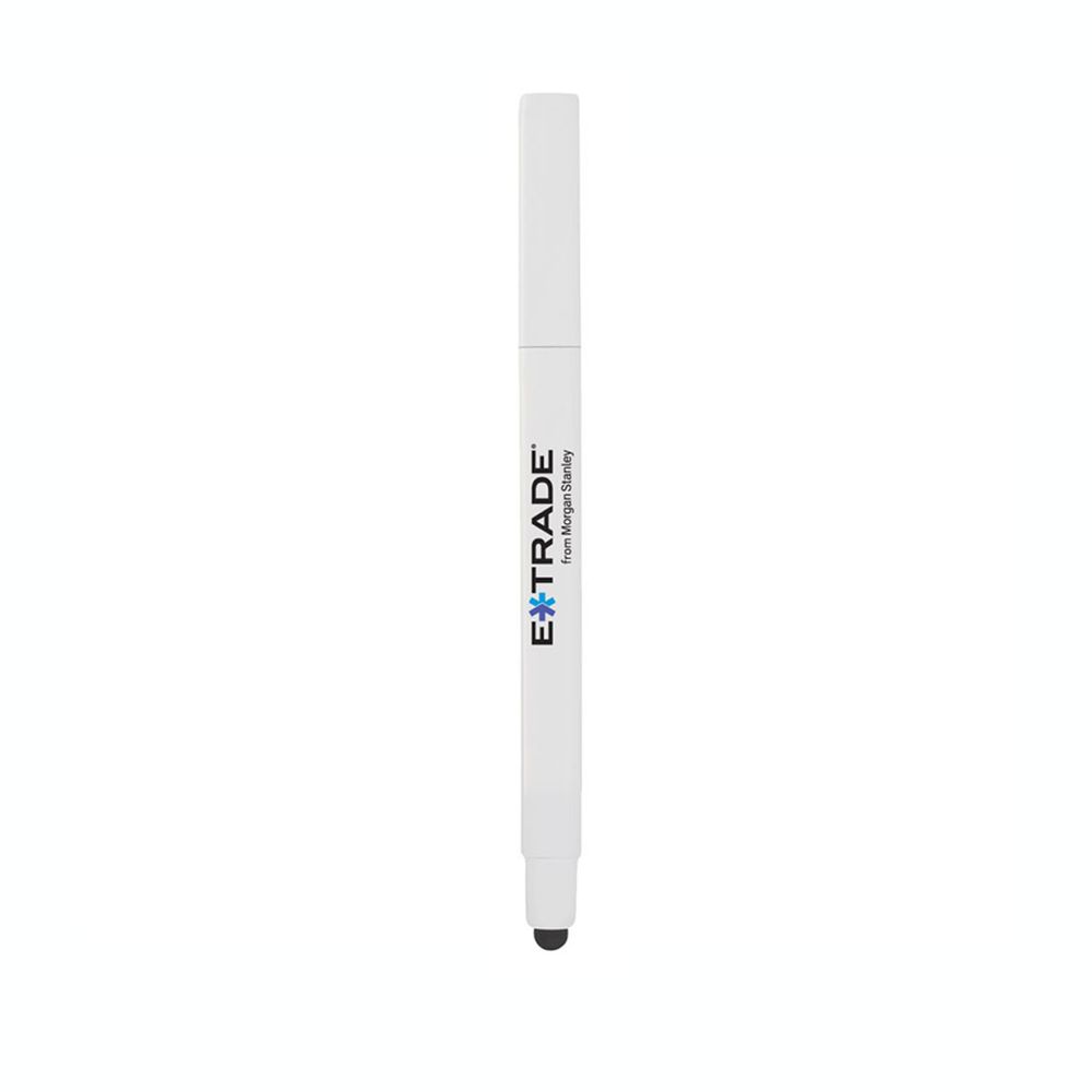 Square barrel with removable pen cap. Metal pen clip allows for this pen to be inserted into a journal spine or on front cover. Soft, rubber stylus. Includes premium black ballpoint ink cartridge. Features your logo printed on the barrel.