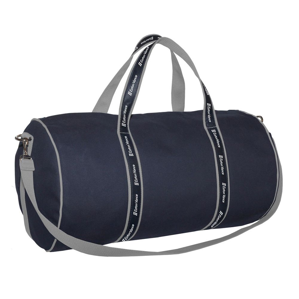 The Original Banker Bag, with its barrel design and removable shoulder strap, takes you through your busy day in comfort and style. Features heavyweight canvas and covered overlap zipper. Handles feature Eaton Vance logo ribbon. Navy canvas with gray webbing. Dimensions: 21"L x 11"H x 11"D. Designed and manufactured in the USA exclusively by Scarborough & Tweed.