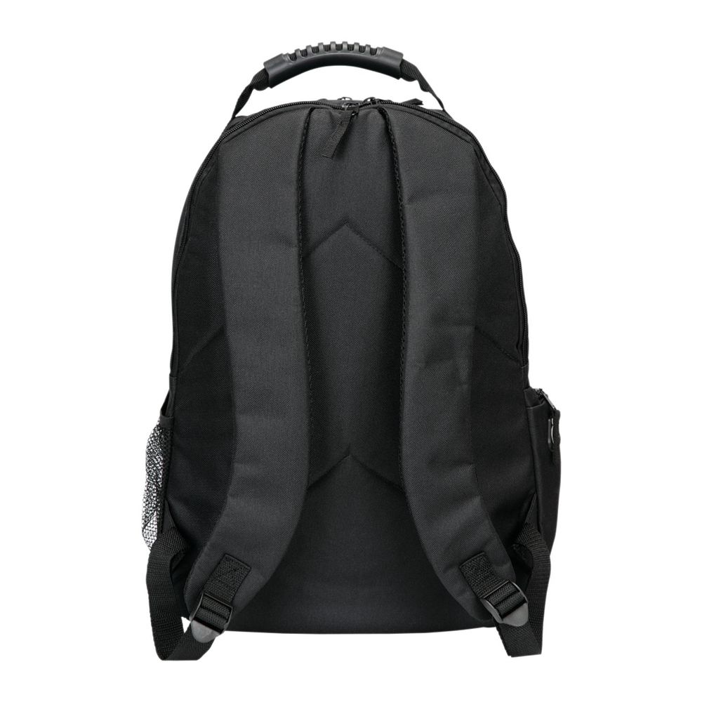 Includes two zippered main compartments and a back compartment containing a padded laptop compartment with a hook and loop secured strap. The zippered front pocket includes a deluxe organization panel with multiple pockets, plus a side mesh pocket and media pocket with an earbud port. A reinforced heavy-duty rubber-trimmed top carry handle also makes it easy to carry. 17" H x 12.5" W x 5" L. Features your logo on the front of the backpack.
