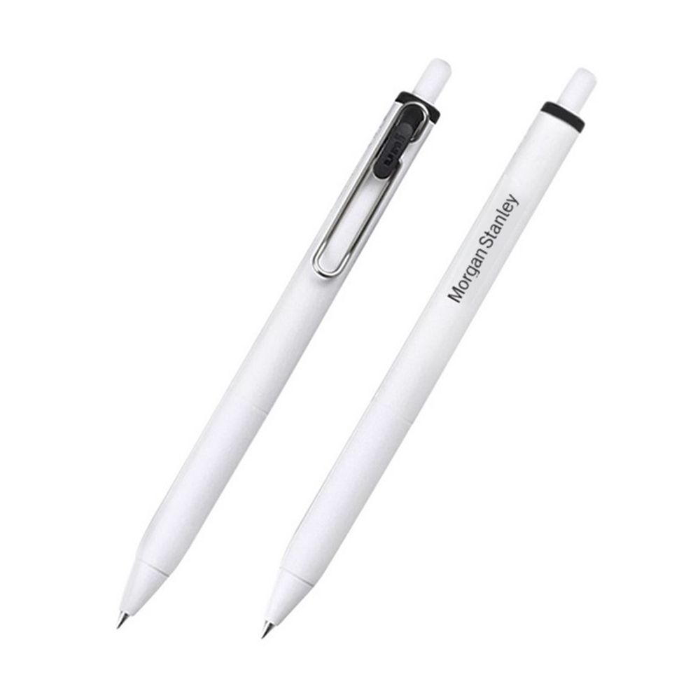 The Uni-ball Gel Pen ink uses a bead packed pigment that is designed to sit on the top of paper instead of being absorbed into it, resulting in a darker appearance. Stylish design features a smooth barrel with a rubberized comfort-grip. Fast drying and bleed resistant. The functional metal clip acts as a paperclip and easily attaches to a notebook or loose papers. Point size: 0.5mm. Black ink. Features your logo printed on the barrel.